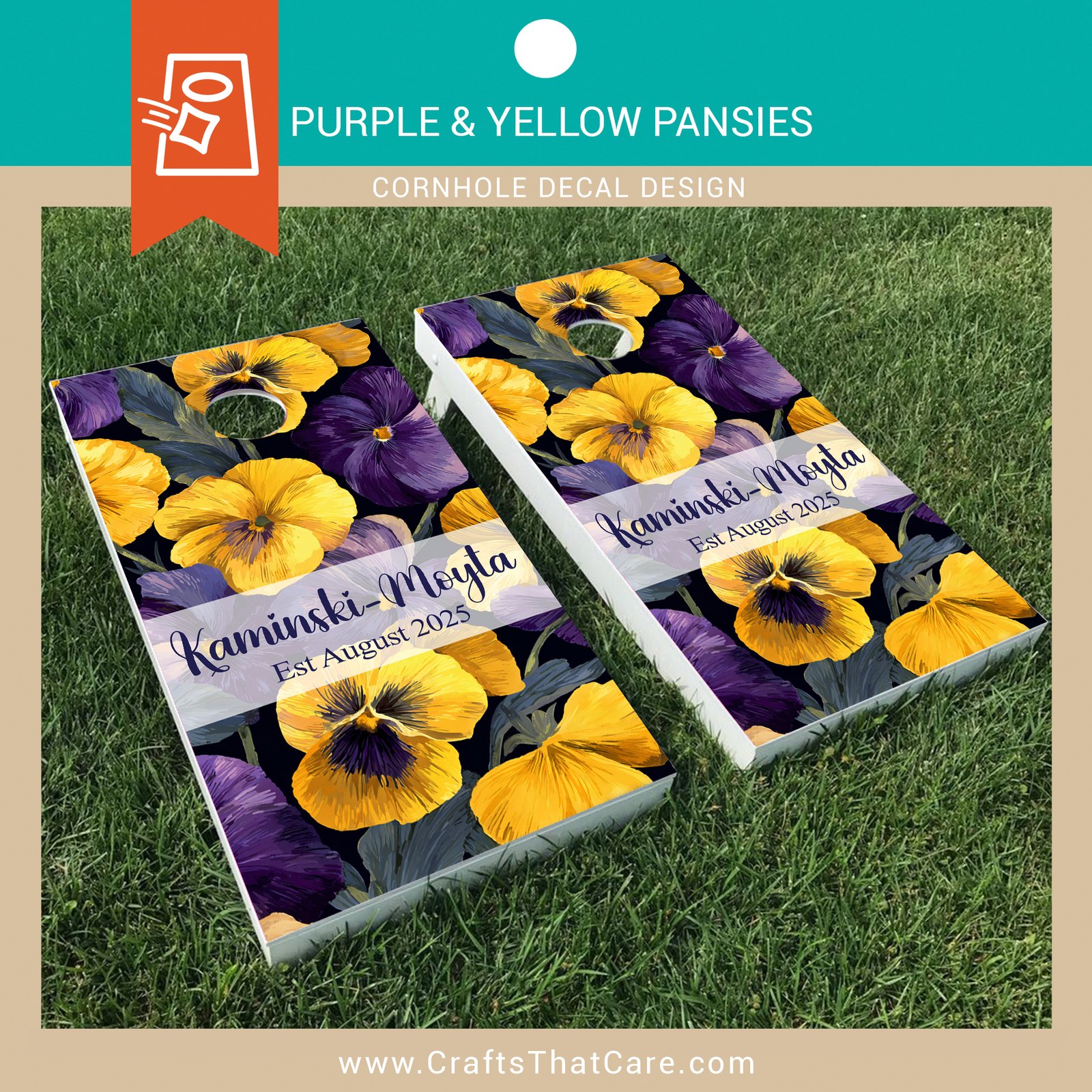 FLOWERS & FLORAL | Custom Purple Yellow Pansy Cornhole Board Decal, Personalized Name Date Floral Vinyl Wrap